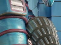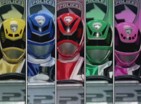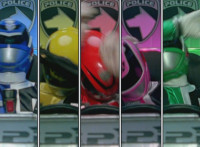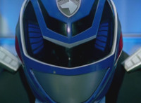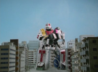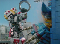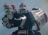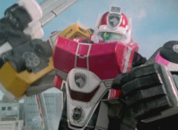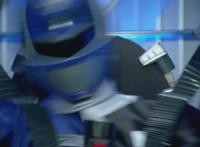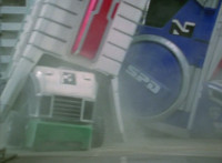 Blue reacts, as Drillbit Robot faces the drill tower, walking toward it, until Delta Squad Megazord fires its Blaster, shooting yellow police tape at the Robot, wrapping around it. As the Robot struggles with its binds, the Megazord gets between it and the tower. |