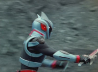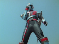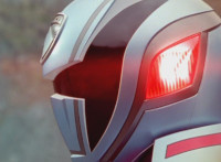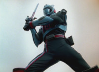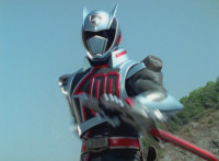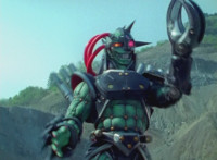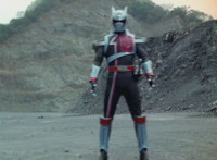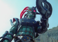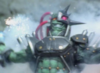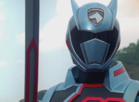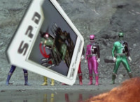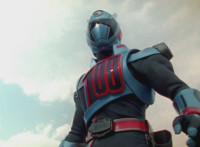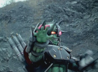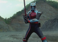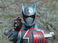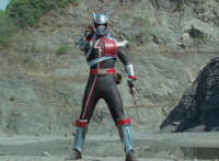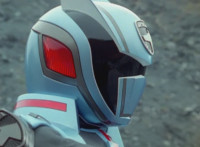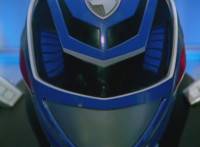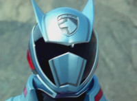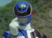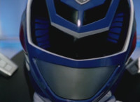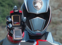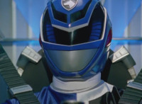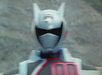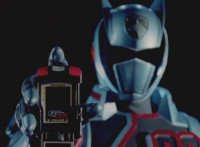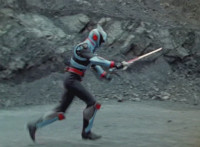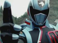 Shadow remains with his saber held downward, nod-talking in zoom in. Benaag recovers and angrily rushes forth, so Shadow waits for him to come to him and he energy slashes him into bursting, writhing, and collapsing. Shadow poses with his saber, as the other five Rangers arrive on the scene, each one reacting to this sight. Shadow whips out his Patrol Morpher and holds it forth at Benaag, talking at him before opening it up, making it glow. |