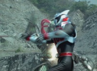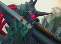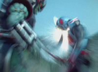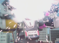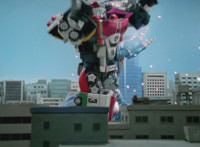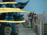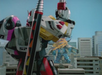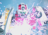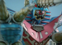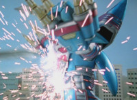 Each Ranger writhes in their cockpits, Drillbit Robot breaks out of its binds, then sparkily strikes Delta Squad Megazord until it topples over onto the ground. |