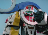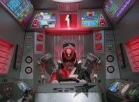 Delta Squad Megazord uses its saber to help stand up, as zoom in on Red in his cockpit. |