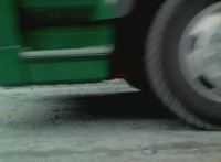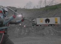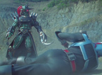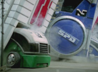 General Benaag leaps in and fights Shadow Ranger, sparkily clawing him twice, then going for a third, only to miss. They keep blocking each other's blows, until Shadow sparkily slashes Benaag twice, then poses with his blade pointed behind him, right at Benaag's throat. They remain deadlocked, talking for a moment, until Benaag squeezes his fist, causing the trailer in the truck above to blow a hole in its side. |