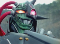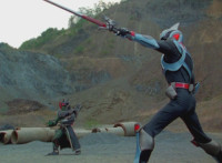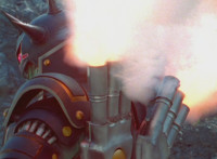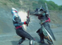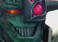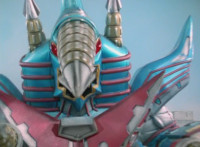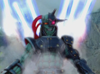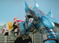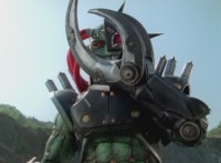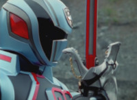 Delta Squad Megazord sparkily slashes Drillbit Robot a few times, before the Robot starts spinning its drill horn, and charges forth, each Ranger reacting quickly, as the Megazord stabs the saber forth, the blade poking into Drillbit's horn, shattering it. Megazord stands triumphant, then the Rangers quickly speak. |