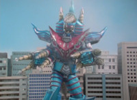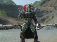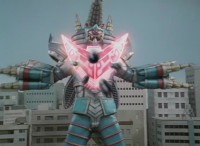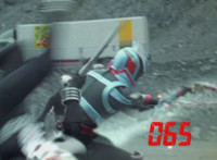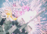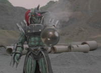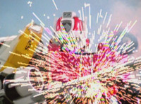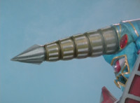Cuts follow-ups of drill tail sparkily stabbing the Megazord. |
