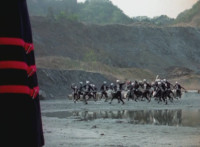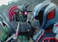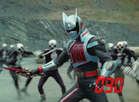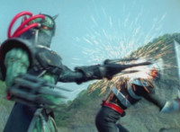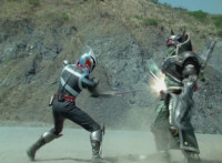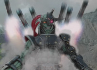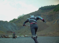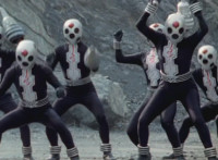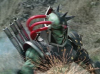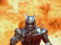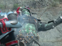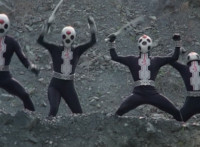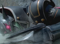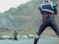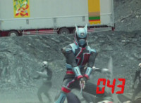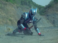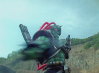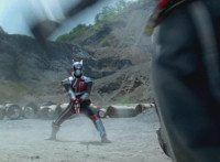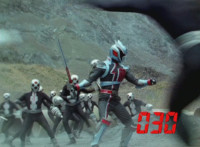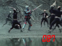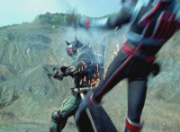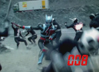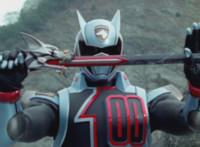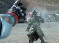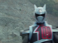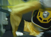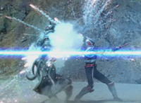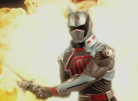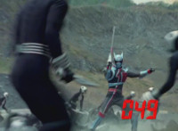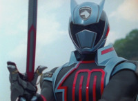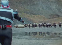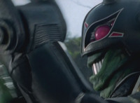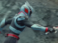 As the camera slides to our right, Shadow Ranger stands in the quarry, facing the 100 Krybots, causing his chest 100 symbol to ignite. Shadow gestures his fingers and hands, motioning them about as he talks and poses, quick beauty shots of his costume details. He unsheathes his Shadow Saber, charging it up so its blade regains its shiny complexion, then poses with it. Krybots charge forth, Shadow stances ready, then dashes into the fray. Suddenly, a counter reading "100" appears onscreen, keeping count as Shadow sparkily slashes his way through Krybot after Krybot. More Krybots pour in, and Shadow dispatches them all, eventually getting down to just 30 left. |