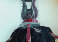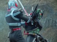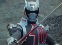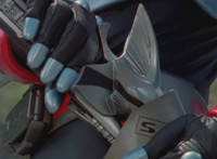 Shadow raises his saber high, then motions it in a circle, as his badge appears behind him amid lightning. |
