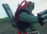 General Benaag fires his left arm rifle forth, a golden shimmering ball of energy flies out at Shadow, who blocks it with his saber blade, then flings it aside at Kat in the trailer. |