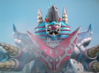 Drillbit Robot punches at Delta Squad Megazord, who blocks it with its saber, but gets shoved backwards as a result. Blue & Green react as they brace the feet to prevent more shoving, Yellow & Pink react as they used the arms to knock the Robot free. Red speaks, as the Megazord sparkily slashes Drillbit Robot, knocking it back. Drillbit Robot staggers back, then pauses and charges up its chestplate. |