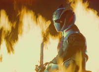 As the Rangers watch, a containment card with Benaag in it flies out of the fire. |