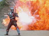 Shadow poses in the foreground, the Rangers watch in the background, and in the middle, General Benaag flares and sparkles, until he collapses and explodes massively. |