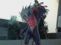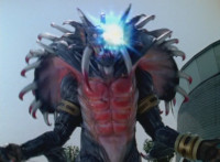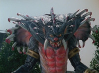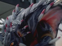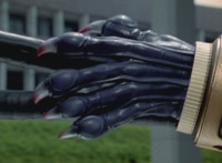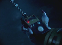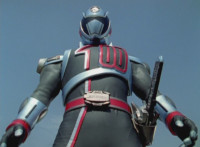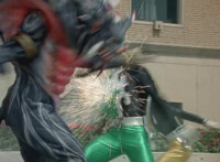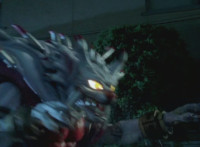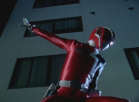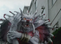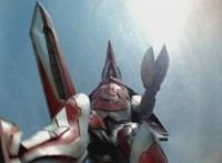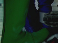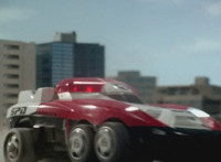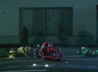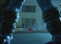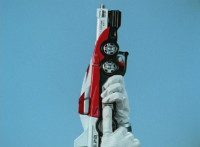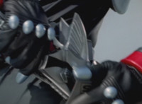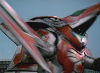 Drakel races at us at night, when suddenly, sunrise breaks over the city, the sunlight hitting Drakel and causing him to pause and shield his face. The Rangers see this, Blue & Green firing their weapons at Drakel. He blocks the lasers with his right arm, causing his bracelet to go flying off. Drakel speaks in a panic, then dashes off and leaps away, Red firing after him before re-collapsing. As the Rangers take a rest, the bracelet falls to the ground before them. Red notices this. |