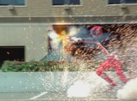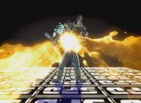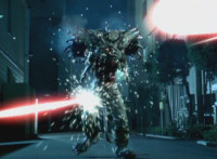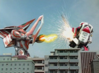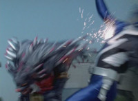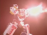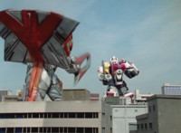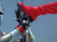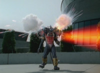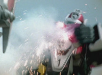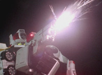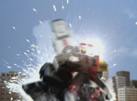 Cuts prior footage of Megazord sparkily slashing Robot. |