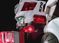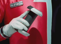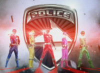 The five Rangers pose with their Delta Morphers held out as they stand in front of a giant SPD Badge. |