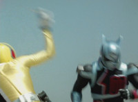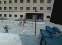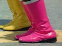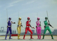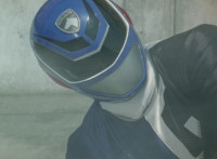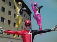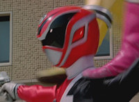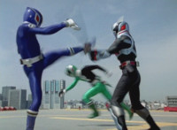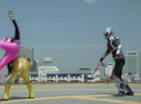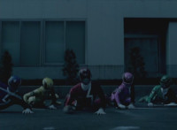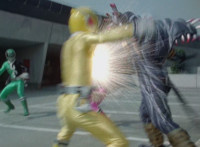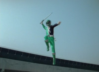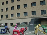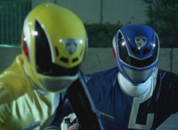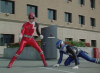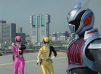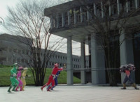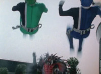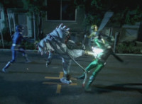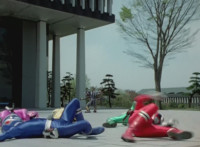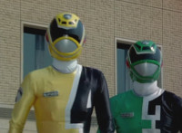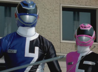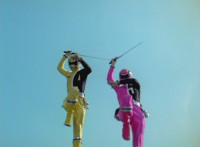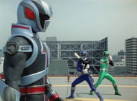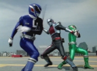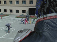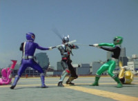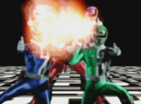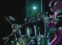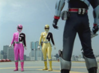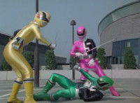 Shadow turns to Green, who nod-talks painfully, before being released. Blue rubs his neck and talks to Green, who responds. Shadow approaches the nodding Pink & Yellow, who begin to attack with their blades, Pink rolling over Yellow's back and engaging Shadow in combat as Yellow tries and fails to footsweep him. Both the Rangers strike him at once, but he knocks both down instead. Shadow grabs Pink by the arm and pulls her up, talking to the pair for a moment, before departing, leaving Yellow looking ashamed and Pink puzzled. Shadow steps into view, nod-talks, and the Rangers regroup to face him. |