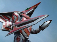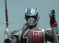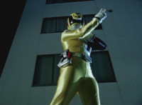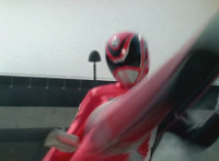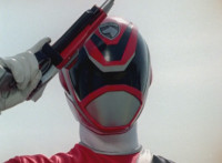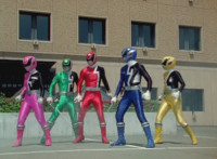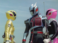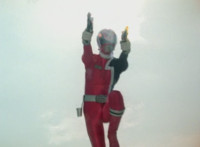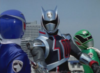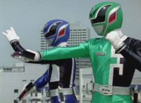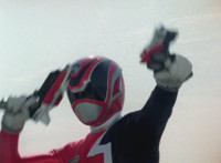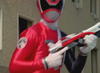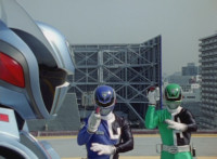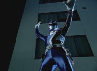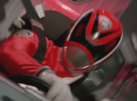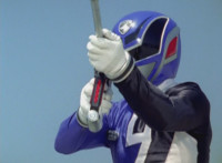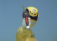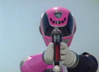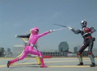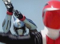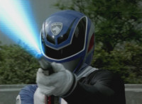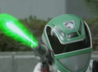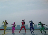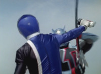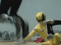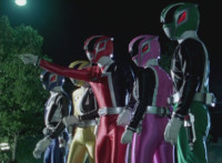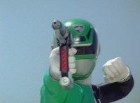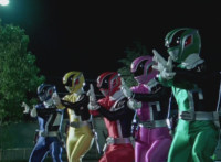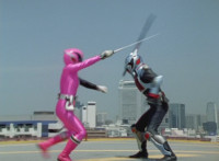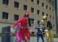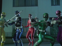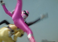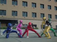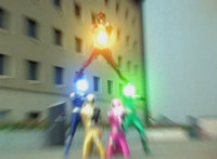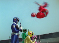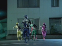 Each one armed, the Rangers scramble again, Yellow & Pink leaping up and striking Shadow at once, but he blocks, then blocks Blue & Green, then slashes them down. He looks up, seeing Red jumpkicking in, which he deflects. Surrounded by the B-Squad, Shadow looks around, as each Ranger aims and fires at him, all missing as he streaks up to avoid the blasts, then streaks around strike each one. |
