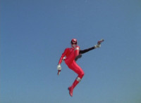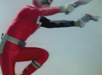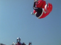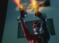Zoom in on Drakel, then Red leads the team in racing forth, Drakel fires eyebeams, Red runs past the explosions, firing his Blasters at Drakel, spark bursting him. Red stops, spins around and spreads arms, Yellow & Pink leap up, bound off Red's shoulders, and leap higher with blades slashing. |