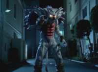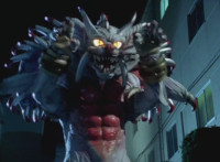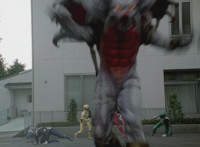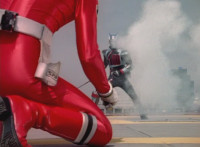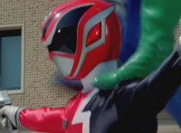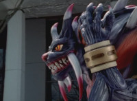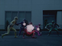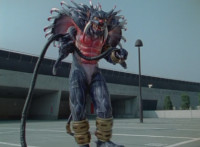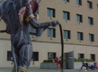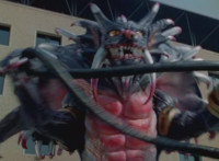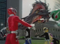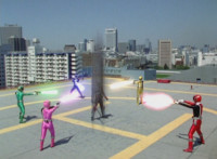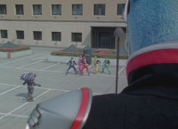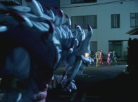 Blue & Red are flung through the air as the tentacles release them, with Drakel swinging the tentacle as they land, recover, Red posing defensively. Drakel talks then turns, as Green leaps in. Drakel tentacle slaps him, causing him to crackle and fall, Yellow & Pink pausing by him, before rushing in and getting sparkily slashed by Drakel, who then does the same to Green, Blue, Pink again, and then Red. The Rangers regroup, Drakel approaches, Red speaks, and on a nearby roof edge, Doggie Cruger steps onto the ledge, above the scene of battle. |