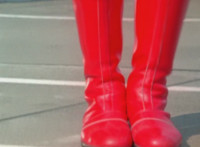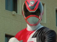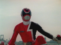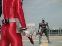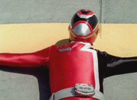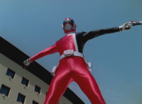 On a rooftop, the Rangers scramble forth, while Red stands his ground. |