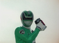 Drakel points and talks, then flashes eyebeams at the Rangers, bursting them down. Drakel gloats, as the Rangers recover, Red pulling out his Delta Morpher and talks into it, Green speaking, then Blue & Yellow. |