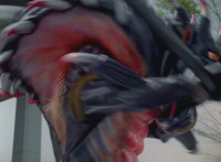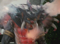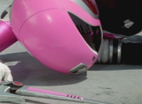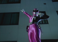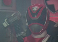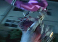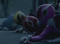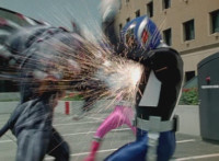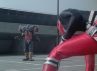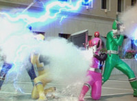 Lasers bounce off Drakel and burst harmlessly around him. Red looks at his ineffective weapons confused, until his teammates rush ahead with their blades in hand, Drakel following suit. Drakel sparkily hits, kicks, and mauls each of the four Rangers, some more than others, like Pink, who soon gets tossed at Red, who catches her, but sets her down safely. The Rangers regroup. |