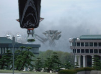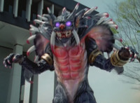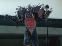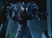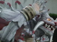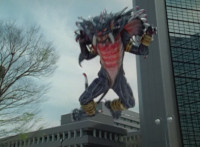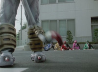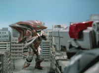 Orange Conenose Robot bursts, then collapses and explodes massively. Red gives a thumbs up, Yellow nod-talks. The five Rangers leap down into a plaza, running forth, Red stopping and looking up when Drakel leaps in and sparkily strikes each Ranger while diving between them. He lands as they fall, turning and eyes glowing as he talks. The Rangers recover, Pink talking, Drakel talking and crackling as he does. The Rangers react, Blue stepping up talking. Drakel speaks then extends his hand and shoots out a pair of tentacles. |