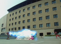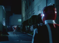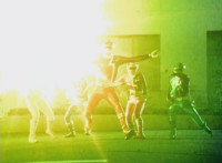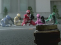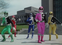 Drakel stops in an alleyway just as the Rangers arrive, he turns to face them, Red talks and points, Drakel responds. Each Ranger poses after a quick glowing shot of their chest number. They pose as a team one way, then another, then a third. |