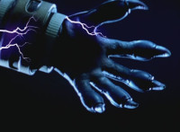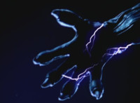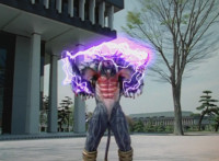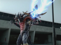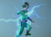 Each Ranger reacts, until Red looks to Drakel, and points at him. Drakel pulls out a spear, talks and gestures, then aims it forth and spews electricity, spark bursting the Rangers down. |