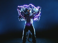 Drakel stands in a dark room, eyes glowing, body crackling, as he talks and gestures in his newly black-toned body. |