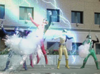 Red leaps up and fires his Blasters forth, Shadow whipping out his Saber and slashing down the blasts, which harmlessly burst around him. Red lands, reacts, Shadow nod-talks to him, Red salutes. Blue & Green have their turn in rushing at Shadow, who blocks and counterstrikes them, but they defend well. Blue gets into position, launching Green into Shadow, who grabs his weapon-wielding arm and pins him in place while slashing at Blue with his other arm. |