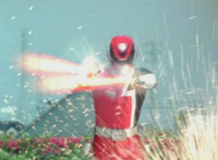 Red rushes forth, Drakel fires electricity at the four Rangers, bursting their weapons as Red leaps over his teammates, three times, Drakel reacting, as all five Rangers fire their weapons at once, the combined energy striking Drakel and bursting him brightly. Red reholsters his Blasters, and the Rangers step forth triumphant. |