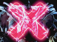 An energy clockface appears over Drakel, as Red holds his Delta Morpher forth, Drakel talking. The Morpher gains a red X, which appears over Drakel. The other four Rangers raise arms, Red pulls out the metal bone and tosses it skyward. |
