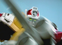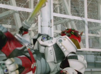 Delta Squad Megazord readies its saber and charges forth, at Gladiator Robot, clashing blades sparkily, locking sabers and switching positions, remaining locked in combat, a quick cut-in of Green and Bluehead at the controls. The pair break off finally. |