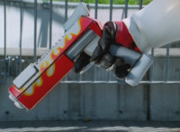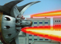 Delta Squad Megazord charges up its Mega Blaster, its tri-colored barrels lighting up colorfully. Numbered colored slices slide in from reverse order of each Ranger in their cockpit, speaking, then aiming forth. Delta Squad Megazord fires its Blaster, spark bursting Dish Robot repeatedly. |