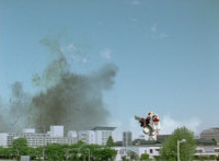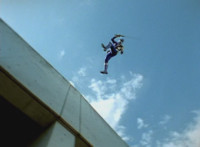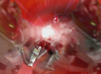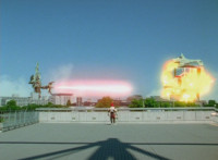 Valko pulls out his blaster, then in a red tunnel as his body trails he fires it forth, bursting the four Rangers, causing them to fall over the side and land on the ground below. Red lies amid smoke, unable to get up, while Valko remains on the upper level above them. Suddenly, the ground quakes! |