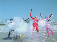Delta Squad Megazord rolls over firing its Blaster as explosions erupt behind it. |
