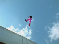 Delta Squad Megazord fires more while diving sideways. |