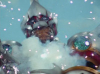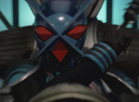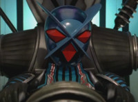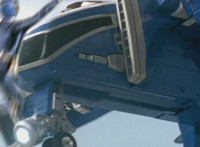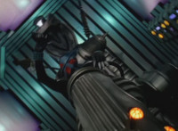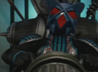 Bluehead gesturing in its cockpit, causing Gladiator Robot to fire its shield cannon again. |
