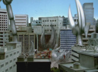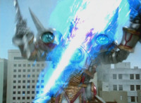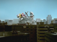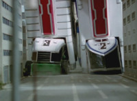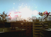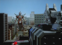 Gladiator Robot sparkles, crackles, collapses, and falls over, but doesn't blow up. Delta Squad Megazord raises its Blaster cautiously, watching the downed Robot. Green nod-talks, when quaking occurs, and Goradon's tentacle claws emerge from underground, each Ranger reacting, as the tentacles wrap around Gladiator Robot and pull it underground. Green reacts, as the dirt wake shoots up over the city as the Megazord stands there, and Valko watches from afar. |