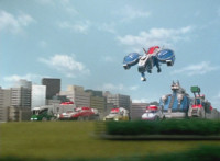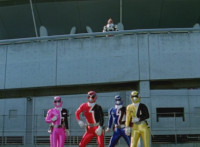 The five Delta Runners race away from the Delta Command Crawler, the four Rangers watching, doing arm motions, before Red leaps up. |