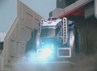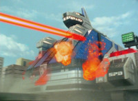 Delta Squad Megazord sideways dives out of the line of fire, firing its blaster as it does so. |