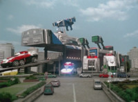 Ground quaking, each Ranger reacts as the unnamed Robot we'll call the Gladiator Robot begins to rise up in the middle of the city. |