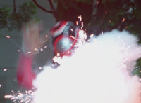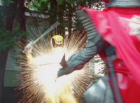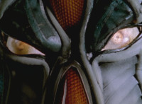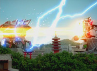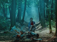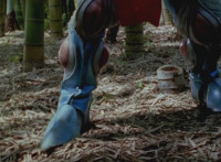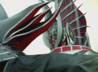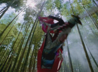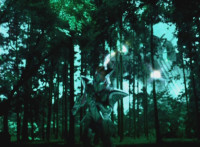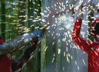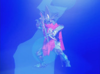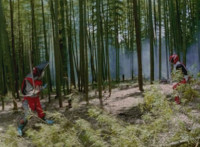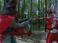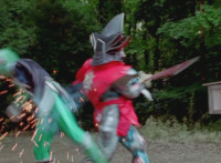 Push in on Katana, then a close-up of him without his headdress on. Katana & Red face each other still. The sun shines down from the crowded treetops, glinting off of Katana's katana, which he uses to blind Red for a moment, then dashes forth, Red quickly following suit. The pair slash at each other, but manage to dodge each other's blades. Katana raises his sword, Red does the same, then both rush at each other again. They sparkily clash blades a few times, until Red flips over Katana, where they then face off, pacing to the side for a bit, before rushing at each other again. Red goes back to back with Katana for a moment, before they break off. Katana then gestures his katana. Lightning crashes down around him. Red readies the Shadow Saber, lightning crashing down around him. Katana raises his blade, so Red rushes forth and up-slices at his weapon. |