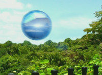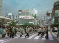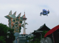 Morato approaches an especially Japanese building, extends a drawer, then dematerializes it into a bubble that shrinks into the drawer, which then closes. |