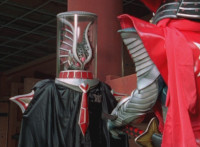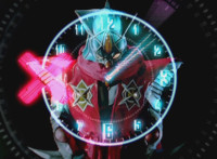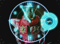 A clockface appears over Katana, with an alternating X and O, as well. Red holds his Delta Morpher forth as we push in on it. Katana quietly awaits sentence, which turns out to be a green circle. Red lowers his Morpher with some talking. Katana remains standing there, not much fight left in him. |