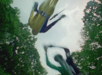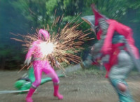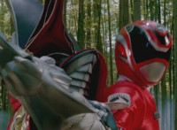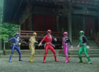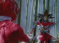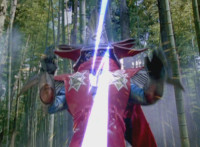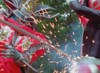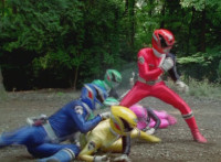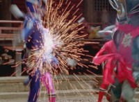 The five Rangers leap over the camera, land on the ground, and stand shoulder to shoulder. Katana points his blade at them, then gets in a stance as each Ranger reacts. Katana gets ready, then charges at them, sparkily slashing his way through them. |