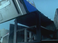 Katana exits a movie studio and looks around the street. He talks to himself, until Broodwing drops in front of him, speaks quick, then takes flight with Katana in his clutches. |