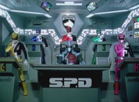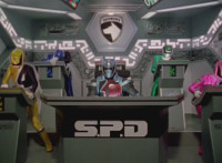 The five Rangers pose with their Delta Morphers held out as they stand in front of a giant SPD Badge. |