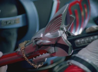 Red rides his cockpit forth while talking, then presses the button next to the "attitude" button. Delta Runners 1 extends its side crane arm out. The back module of Delta Runner 4 detaches, the saber blade comes out of Delta Runner 3, and Delta Runner 1's crane arms connect the two components together into the Delta Squad Megazord's Saber, which is then attached to Delta Runner 1's left side. |