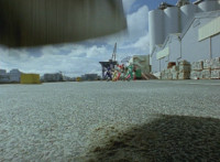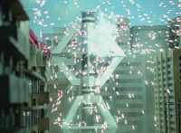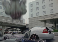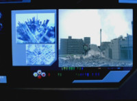 Cuts prior shots of buildings exploding; shot 1 cuts before car explodes; shots 2 & 3 are split from each other for no reason; shot 6 is textless, unlike source. |