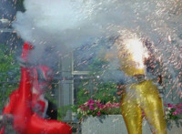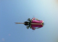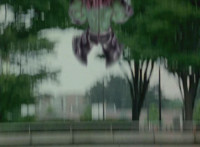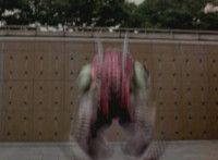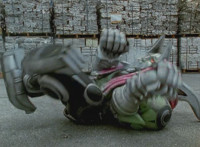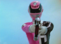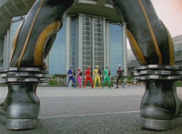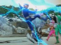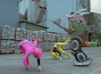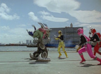 Shorty flips onto a car, crushing it, then bouncing off. He then lands in another area, as the four Rangers appear, zoom in on Pink talking and pointing. Shorty turns and talks, gesturing his arms about. Red talks, Shorty replies, then leaps up high and lands upon them, smashing the ground around them to bits, as they dive out of the way in the nick of time. The four Rangers pull out their weapons and fire on Shorty, but he reflects their laserbeams back at them sparkily. |