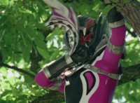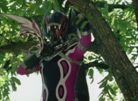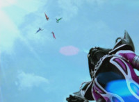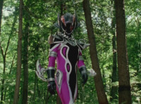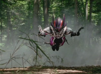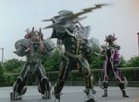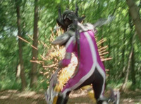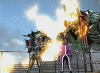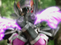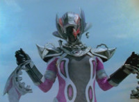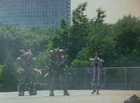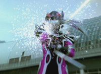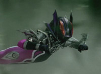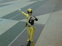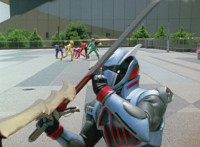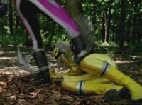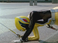 Morgana, helmet finishing sealing, blocks the yelow bolts, then leaps up, flying through the sky for a moment, then looking upward and seeing the four Rangers flying above her in formation, firing their weapons downward at her, bursting her back down. As she falls, Yellow leaps up and energy slashes her, causing her to fall harshly to the pavement. |